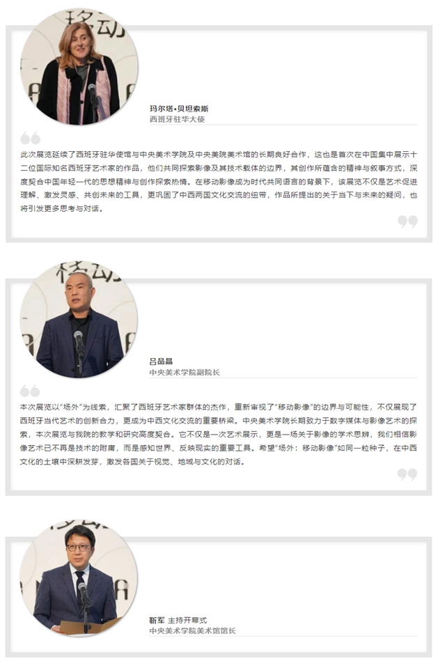 11月14日,由中央美术学院美术馆 与 西班牙国际合作发展署、西班牙驻华大使馆、深圳文泽创展文旅发展有限公司联合主办的“场外:移动影像”展览在中央美术学院美术馆开幕。展览由当代艺术研究员苏珊娜·桑斯策展,汇聚了十二位西班牙艺术家,旨在为西班牙电影与当代艺术提供全新的解读视角。  中央美术学院副院长吕品晶、西班牙驻华大使玛尔塔·贝坦索斯出席开幕式并致辞,西班牙驻华大使馆及多国驻华使馆代表、西班牙籍艺术家代表、兄弟院校代表以及中央美术学院相关院系部门负责人参加开幕式