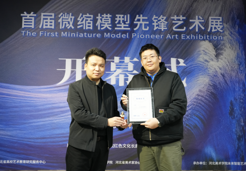 河北美术学院校领导为特邀艺术家颁发收藏证书 26位微缩模型艺术家向学校捐赠《摩登红军战士》《超精细人物头雕》等30件作品,甄墨代表学校接受捐赠,校领导为特邀艺术家颁发收藏证书。