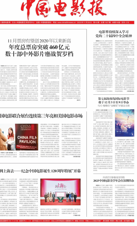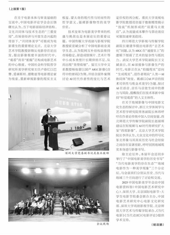 11月26日,《中国电影报》头版报道了会议 (并刊登深圳大学吴报水副书记致辞照片) 年会主论坛的讨论涵盖电影本体、技术变革与地域影像等多个方向,各位专家学者围绕电影本体与审美基础、技术变革为电影美学带来的机遇与挑战、地域影像与中国电影文化生态等议题进行了研讨。 中国电影评论学会会长饶曙光认为,当下电影面临经济结构、文化共同体与技术生态的“三重变局”,在场景经济与开放生态兴起的背景下,“共同体美学”可能成为电影重生的重要理论支点。中国传媒大学戏剧与影视学院教授索亚斌分析了中国电影商业美学生态,认为院网互补结构虽维持市场稳定,却造成惊悚片、艺术片等中小成本类型片长期供给不足,从而出现“类型收缩”。北京大学艺术学院院长李洋认为,大众文化中的符号化东北形象与其真实历史与社会经验之间存在显著差距,呼吁回到地域现实本身进行影像书写。